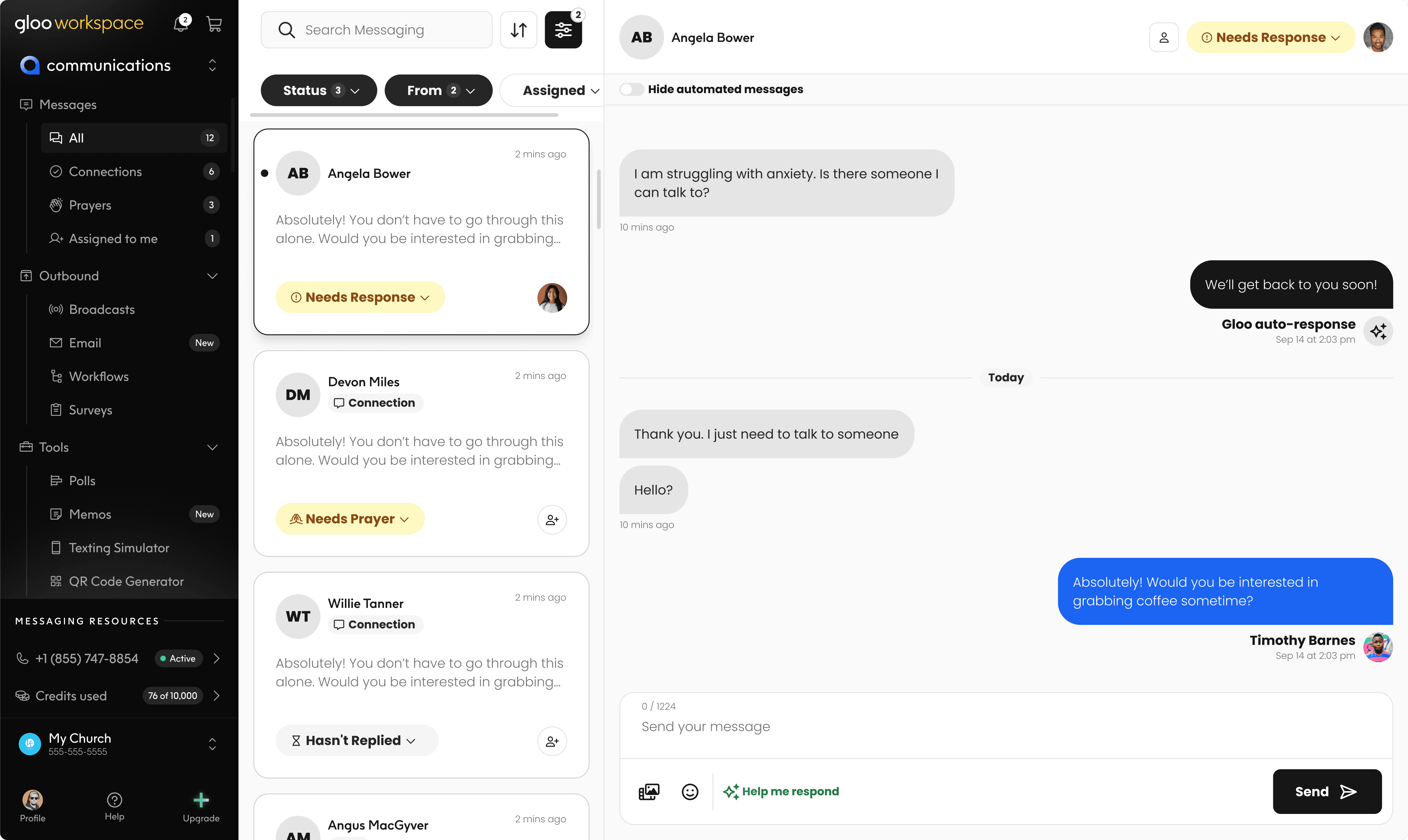 Keep prayer at the center of your ministry. With Gloo Messaging, you can receive instant prayer requests, share prayer team updates, and respond to the needs of your congregation—right when it's needed most.