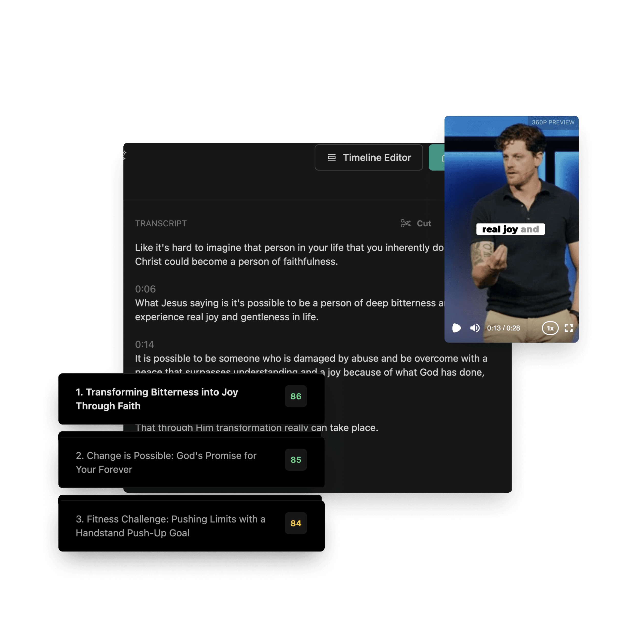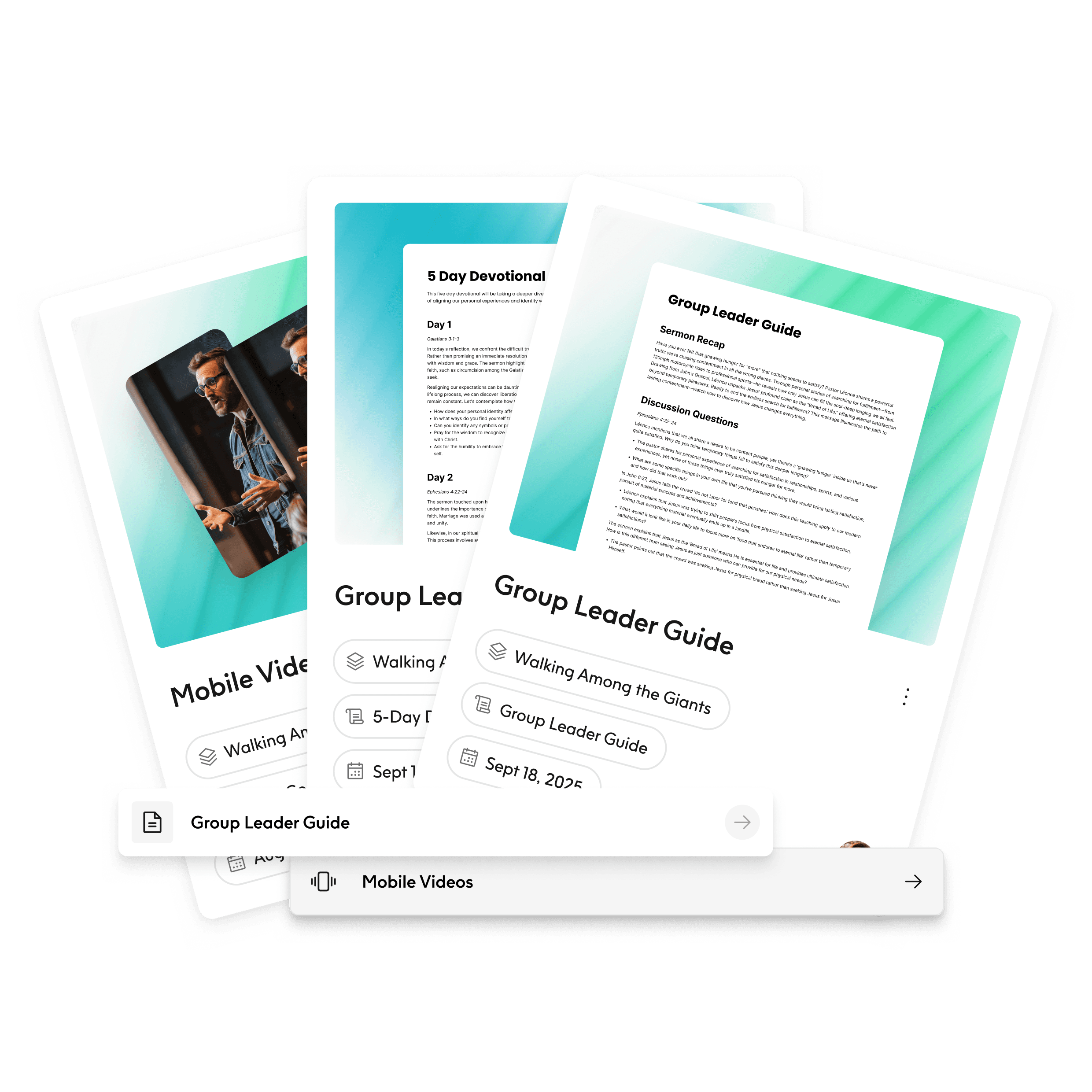 Spend less time creating content and more time leading your church. Turn your sermons into social clips, devotionals, and discussion guides –automatically.